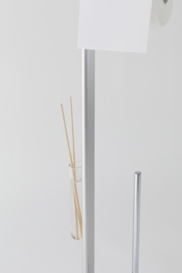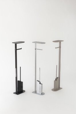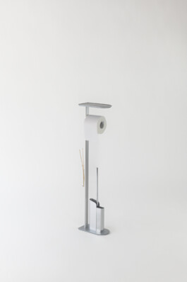 Toilet brush holder/Toilet paper stand for small spaces. A vertical column designed to accommodate accessories that enhance the functions of the Flat brush, incorporating a surface for placing objects, a toilet paper holder arm, and a reservoir for mikado-style fragrances. Stable and sturdy, it follows the essence of the family, featuring distinctive attributes while being highly adaptable to all types of bathrooms.